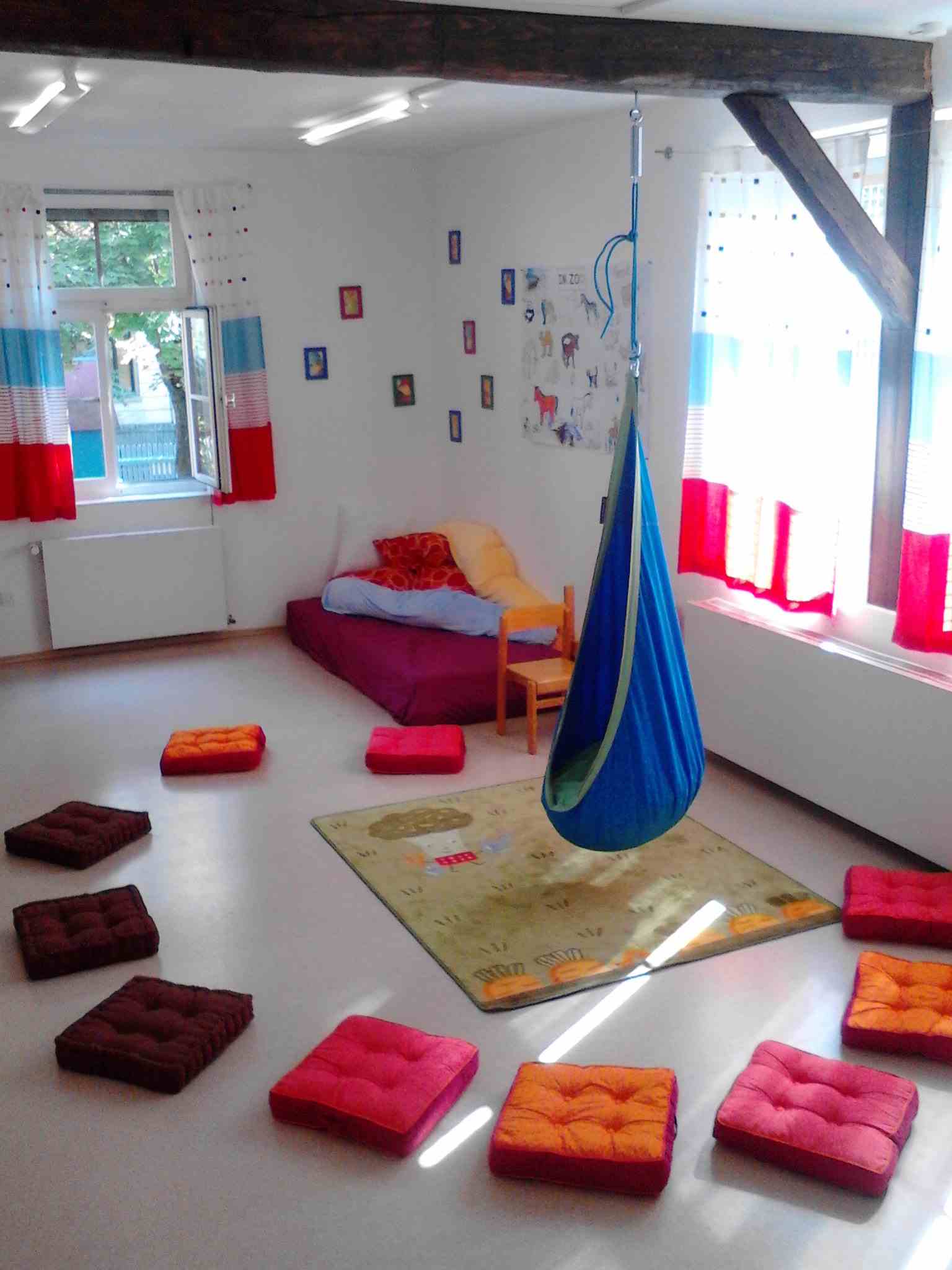 Ein großer, freundlicher Gruppenraum, ein extra Wickelraum mit Rückzugsmöglichkeit, gut ausgestattete Teeküche, Garderobe und viele ruhige Ecken. Spiel- und Bastelmaterial für Geschwisterkinder ist vorhanden. Genügend Matratzen, Kissen und Stillkissen ebenfalls.